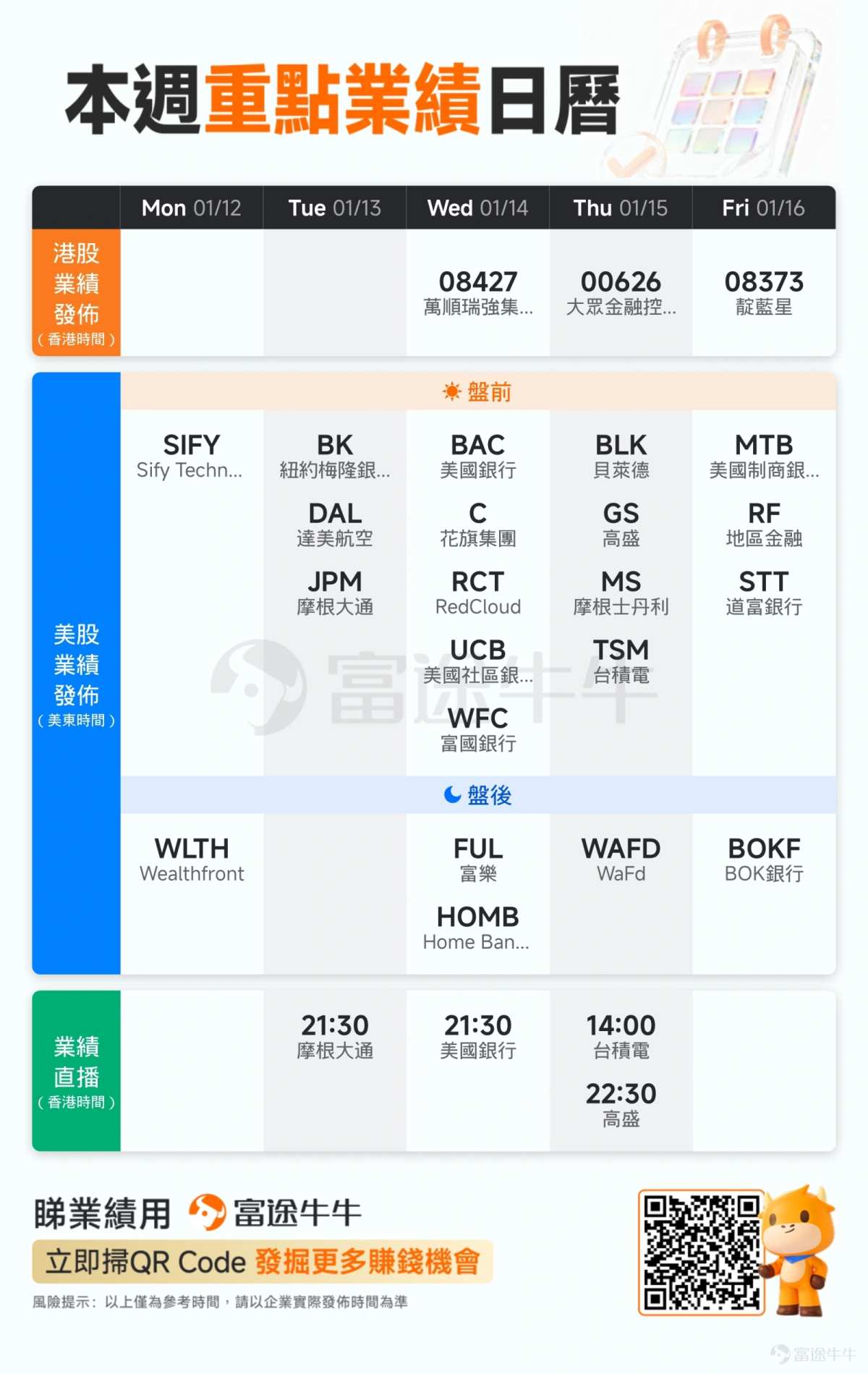 业绩方面, $大众金融控股 (00626.HK)$ 将公布业绩, $贝莱德 (BLK.US)$ 、 $高盛 (GS.US)$ 、 $摩根士丹利 (MS.US)$ 、 $台积电 (TSM.US)$ 将于美股盘前公布业绩, $WaFd (WAFD.US)$ 将于美股盘后公布业绩。