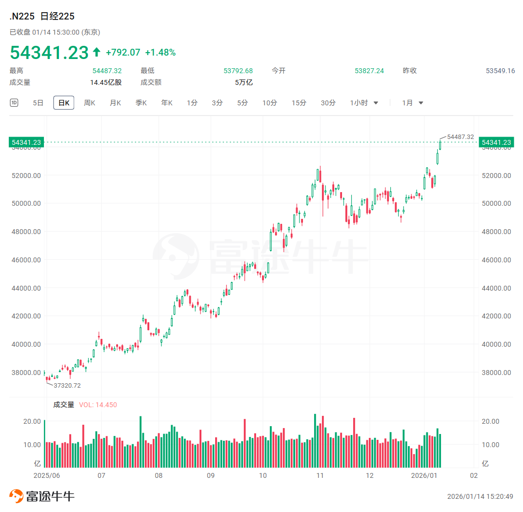 $日经225 (.N225.JP)$ 周三涨超1%,突破54000点大关,创历史新高。 $TOPIX指数 (.TOPIX.JP)$ 同样延续涨势,涨1.26%。这是高市自上任以来首次面对选民,她支持宽松货币政策并宣布了大规模经济刺激计划,被市场视为利好信号。