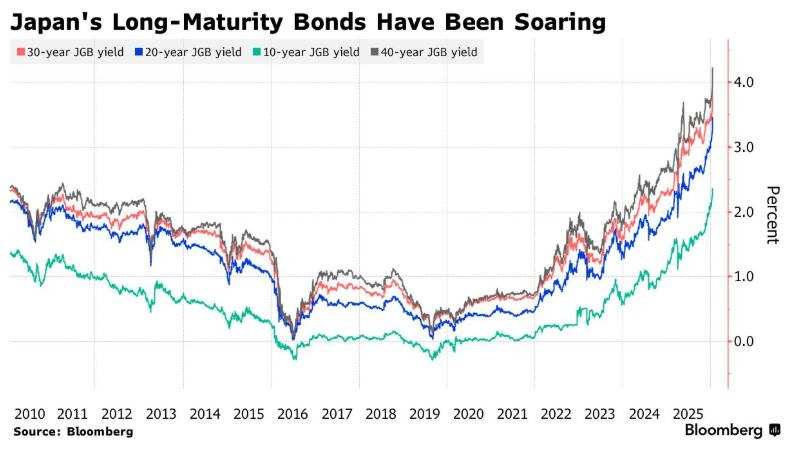 周二日本主权国债市场可谓遭遇历史罕见的大规模抛售,长期限国债收益率更是飙升至创纪录的历史最高位——$日本40年期国债收益率 (JP40Y.BD)$在周二前所未有地升破了4%超级关口,创2007年该品种发行以来的最高水平,近日可谓屡创历史新高。最新这轮日本国债崩盘可谓全面蔓延至全球金融市场,一些华尔街资深分析人士甚至担忧日债抛售浪潮可能导致全球股债市场跟随日本国债崩盘,进而导致类似2024年8月初的“黑色星期一”全球股债汇超级大崩盘,因此开始呼吁日本央行立即启动紧急债券购买操作来安抚市场。