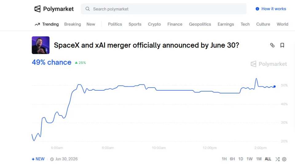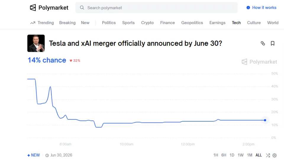 市场的实时预测反映了这种不确定性。预测平台Polymarket的数据显示,SpaceX与xAI在2026年6月30日前正式宣布合并的概率约为48%,而特斯拉与xAI合并的概率仅为14%。这大致印证了“先易后难”的逻辑:私有公司之间的合并(方案A)是更务实、更可能率先取得突破的路径。