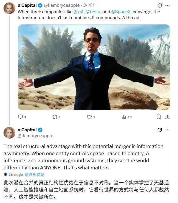 正如有网友在社交媒体的深度分析中指出的,这种整合带来的“信息不对称”优势是决定性的:“当一个实体掌控了天基遥测、AI推理和自主地面系统时,它看待世界的方式将与任何人都截然不同,信息速度才是真正的护城河”。