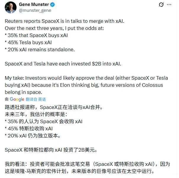 深水资产管理公司管理合伙人吉恩·蒙斯特(Gene Munster)的分析代表了部分投资者的务实看法:特斯拉收购xAI的概率(45%)甚至略高于SpaceX收购xAI(35%),因为“这是马斯克的宏伟计划”,而“马斯克的公司之间总是会友好相处”。