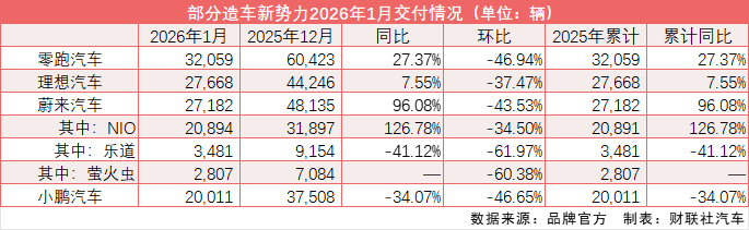 财联社2月1日讯(记者 徐昊)2月1日,造车新势力 $零跑汽车 (09863.HK)$ 、 $理想汽车 (LI.US)$ / $理想汽车-W (02015.HK)$ 、 $蔚来 (NIO.US)$ / $蔚来-SW (09866.HK)$ 和 $小鹏汽车 (XPEV.US)$ / $小鹏汽车-W (09868.HK)$ 先后发布1月交付量。四家车企均实现同比增长,但相较于去年12月,交付表现出现明显下滑。