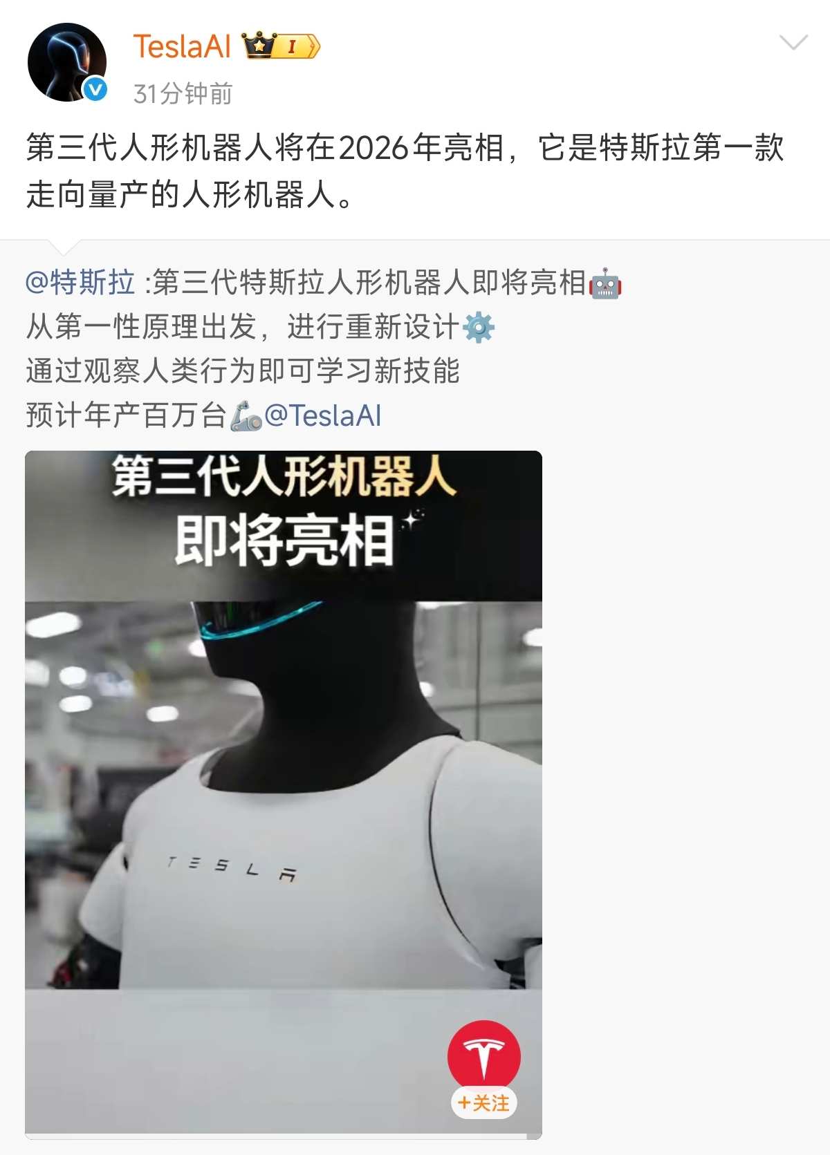 《科创板日报》2月2日讯(编辑 宋子乔) $特斯拉 (TSLA.US)$ 官微今日宣布,第三代特斯拉人形机器人Optimus V3(擎天柱第三代)即将亮相,它将是一款通用人形机器人,通过观察人类行为即可学习新技能,可通过演示、口头描述、展示视频让机器人执行任务,预计年产百万台。