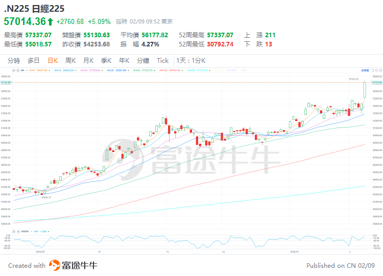 高市早苗领导的自民党单独获得众议院三分之二的超级多数席位,这一议席比例为日本战后选举中任何政党的最高水平,日经225指数涨幅扩大至5%,史上首次站上57000点,日本东证指数涨幅扩大至3%,而日元和国债则面临进一步下跌的压力。