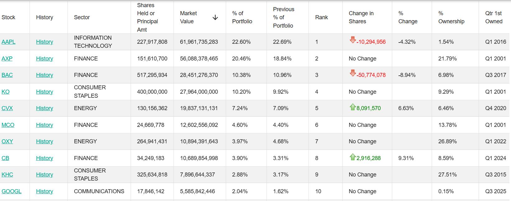 尽管持续减持,到四季度末,苹果仍是伯克希尔的头号重仓股。