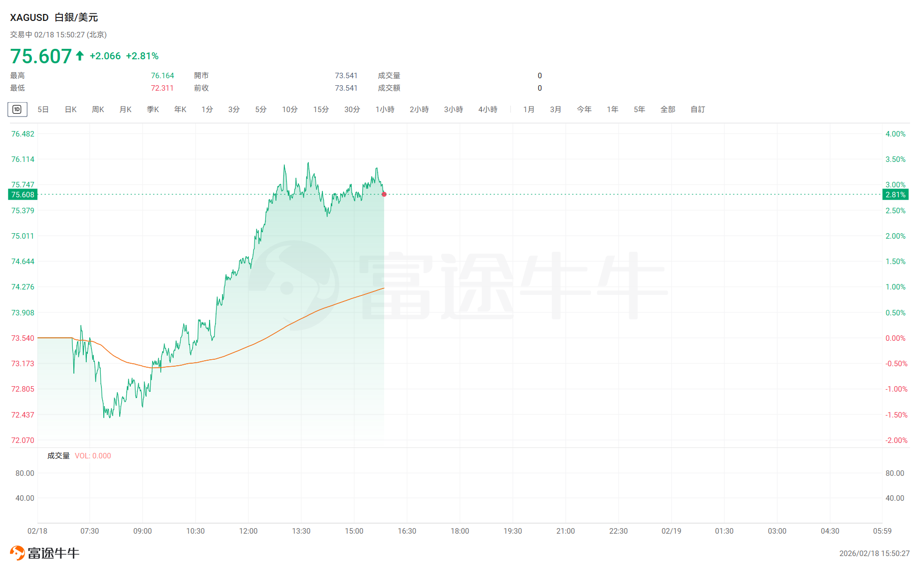 现货白银日内现涨2.81%,报75.607美元/盎司。