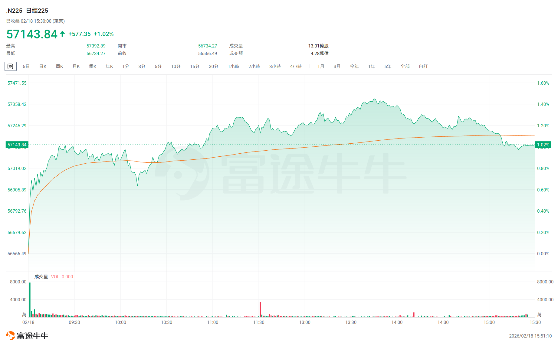 周三日股高开高走,截至收盘,日经225指数上涨1.02%,盘中涨幅一度飙升超过600点,强势站上57000点关口。日本东证指数上涨1.21%至3807.25点。