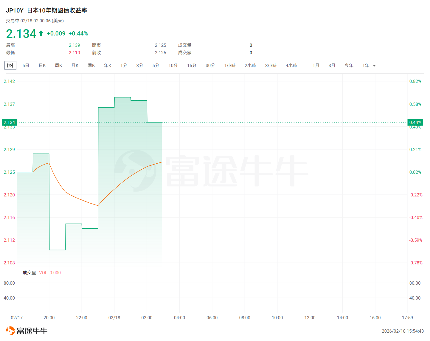 投资者对新内阁可能延续或加码经济刺激政策的预期,推动日本股债齐涨,日本各期限国债收益率全面下行,$日本10年期国债收益率 (JP10Y.BD)$下行至2.134%附近。