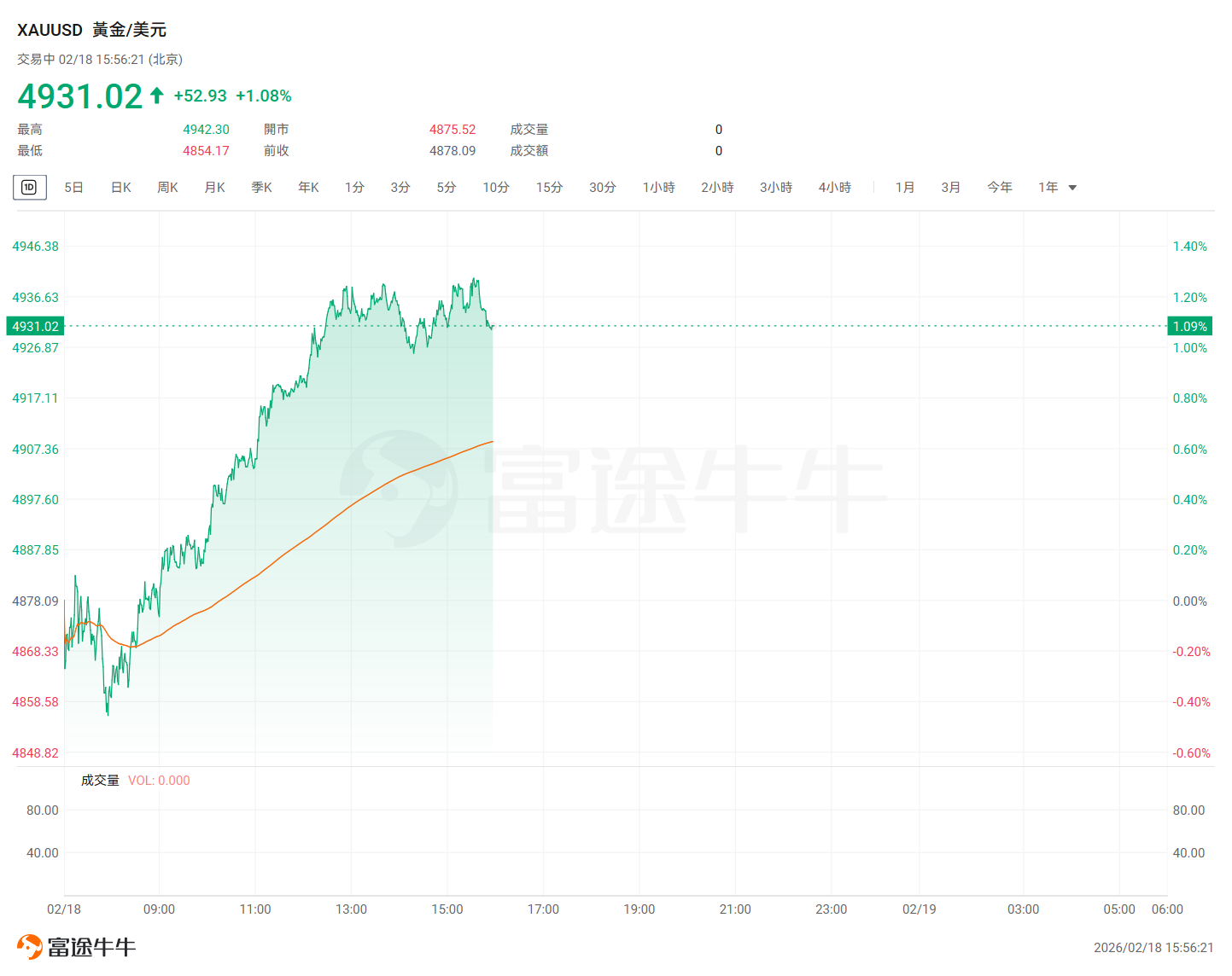 现货黄金周三低开后,较日低拉升超1%,重回4900美元上方。白银同样反弹上行,涨逾2%。