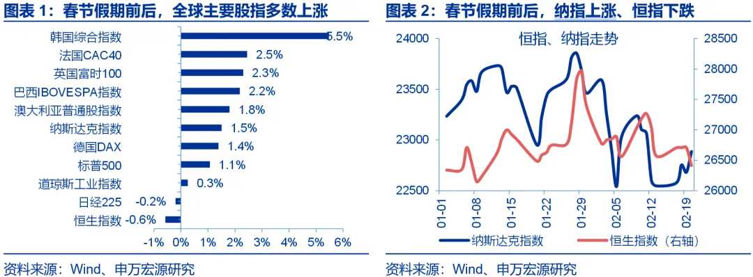 春节假期前后(2月16日-2月20日),海外股指多数上涨。美股方面,受最高法裁定IEEPA关税违法对风险偏好的提振,纳指、标普500和道指分别上涨1.5%、1.1%和0.3%。亚洲市场,韩国综合指数大涨5.5%,恒指下跌0.6%。欧洲方面,CAC40、富时100、DAX30集体上涨。