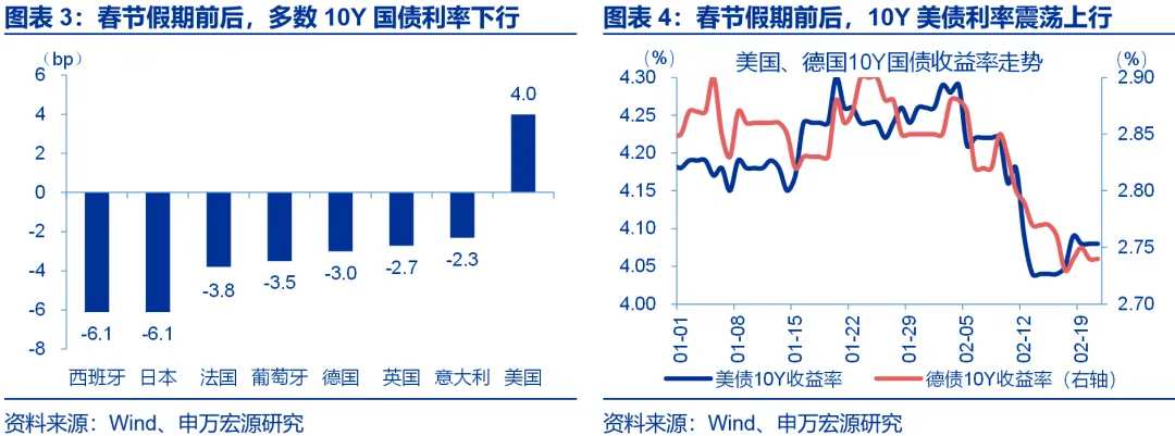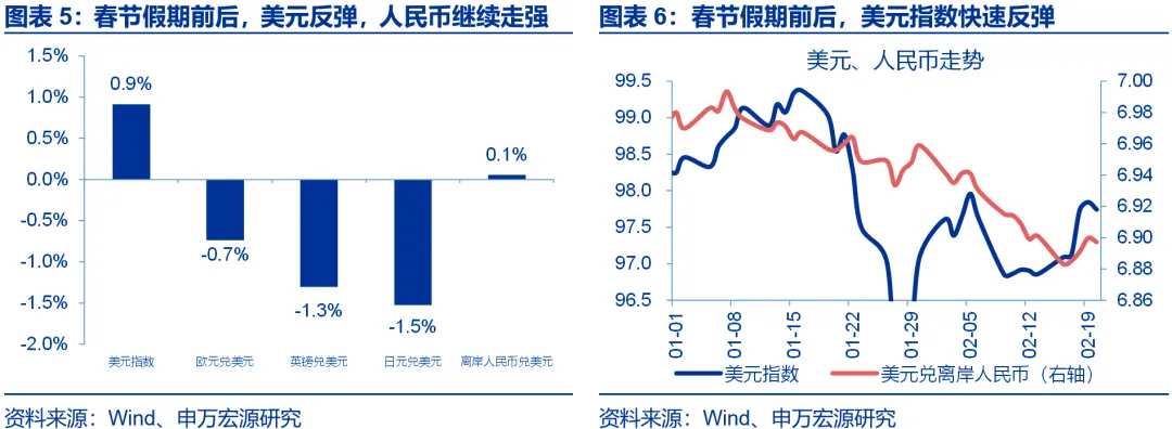 春节假期前后(2月16日-2月20日),美元指数反弹0.9%、离岸人民币一度升至6.88。欧元、英镑、日元兑美元均有所贬值,贬值幅度分别为0.7%、1.3%、1.5%。美元指数的反弹,主因美德利差的走阔;假期期间,由于通胀走势的分化,10年期美德利差走阔7bp。而受益于“结汇潮”的推动,在美元快速反弹的背景下,离岸人民币仍延续了较强的表现,并一度升至6.88。