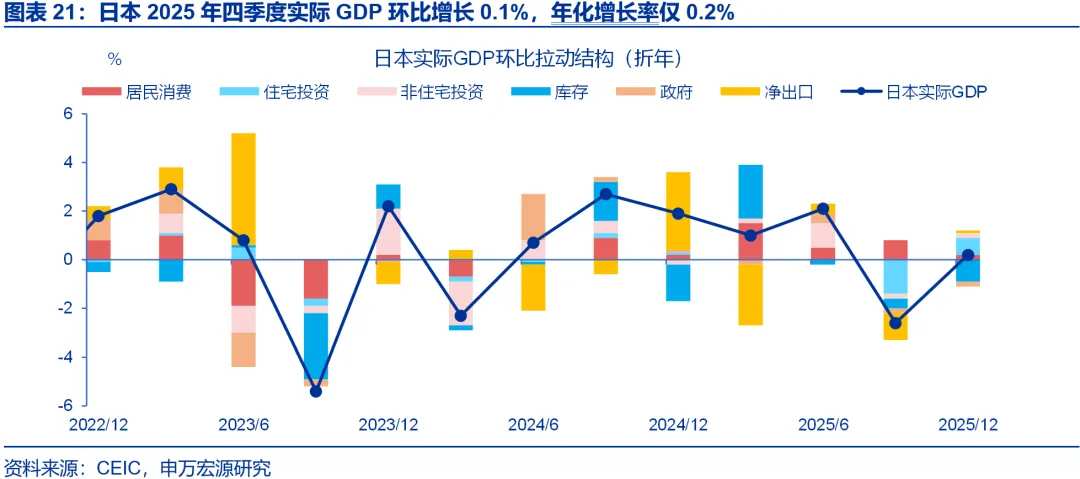 四季度日本经济增长弱于市场预期。日本2025年四季度实际GDP环比增长0.1%,年化增长率仅0.2%,低于市场预期(0.4% QoQ / 1.6% 年化)。结构上,四季度日本住宅投资环比改善,居民消费小幅走弱。关注日本2026年“春斗”结果。