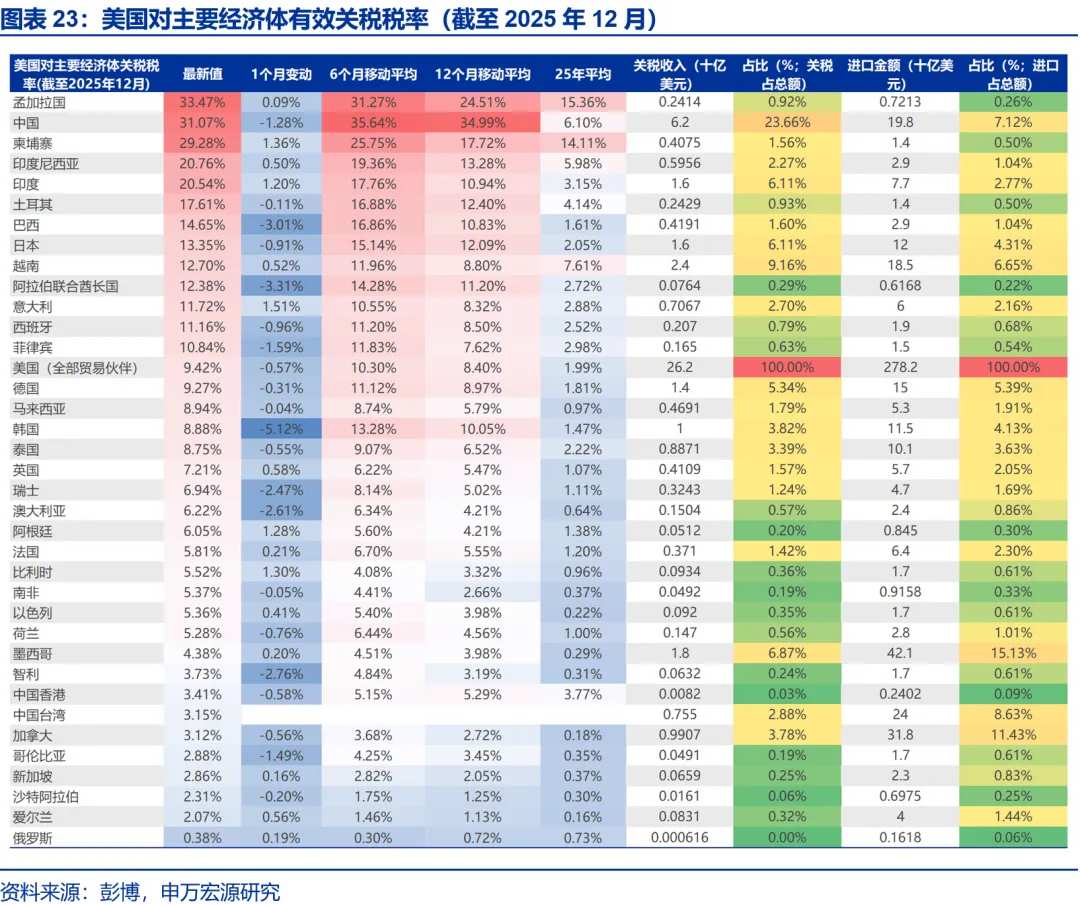 不考虑122关税替代措施,对等关税失效或使美国有效关税税率下降7-8个百分点。关税判决前,美国对全球有效关税税率为16.9%,其中对中国为31.07%,印度22%,日本14.9%,越南21.6%,意大利13.6%,德国13.7%,韩国12.8%。对等关税失效后,在不采取额外措施的情况下,美国有效关税税率或降至9.1%,对中国税率或降至15.4%,印度降至8.2%,日本降至9.9%,意大利降至7.0%,德国降至7.7%,韩国降至9.3%。中国、巴西、印度、越南等受益较大。