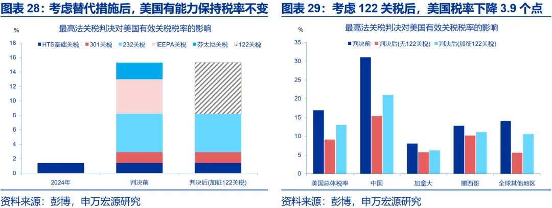 考虑122关税替代措施后,美国关税税率或仅下降3-4个百分点。对等关税失效后,特朗普随即启用122条款,在10%税率的情况下,美国有效税率或将下降3.9个百分点。但122条款失效后,若依赖232与301条款补足缺口,美国或需将301关税由中国扩大至多个主要贸易伙伴,将232关税覆盖范围进一步扩围。