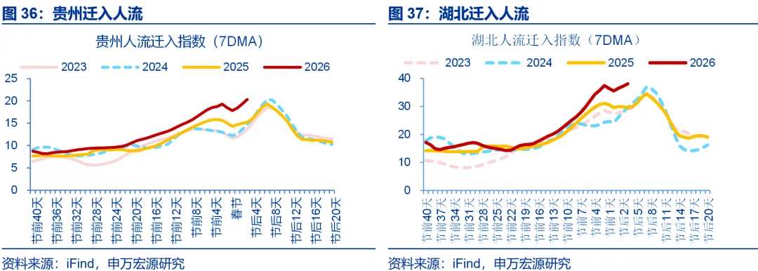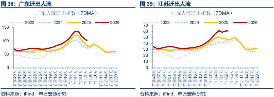 典型地区的人流出行特征亦可印证,劳务输出大省的迁入强度、用工大省的迁出强度在除夕前3日集中上行至阶段性高位。从典型地区的人流出行方向看,以湖北、贵州为代表的劳务输出大省迁入强度自除夕前1周的1%、2%分别上行至除夕前3天36.1%、14.2%;相应地,广东、江苏等劳务用工大省迁出强度也分别自除夕前1周的4%、5%左右上行至除夕前3天18.5%、21.3%。