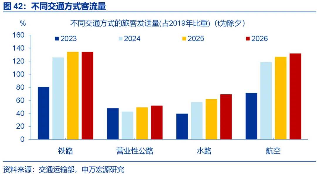 特征二:春节假期第3日后,人流出行强度进一步走高,或指向假期旅游出行需求强劲释放。春节假期第1-6日(2月15日至2月20日),日均人流同比较春运返乡期间上行0.9个百分点至4.6%。节奏上,人流出行强度在春节假期第3天(2月17日,正月初一)后走高,同比自-5%上行至12.3%;主因自驾出行客流反弹,同比自-7.1%上行至12%。公共交通日均旅客发送量也有上行,同比较春运期间上行5.8个百分点至11%;其中公路营运性客运量涨幅较大、同比上行7.7个百分点至13.7%,铁路、民航旅客日均发送量同比分别回升3.2、1.6个百分点至5.9%、6.1%。