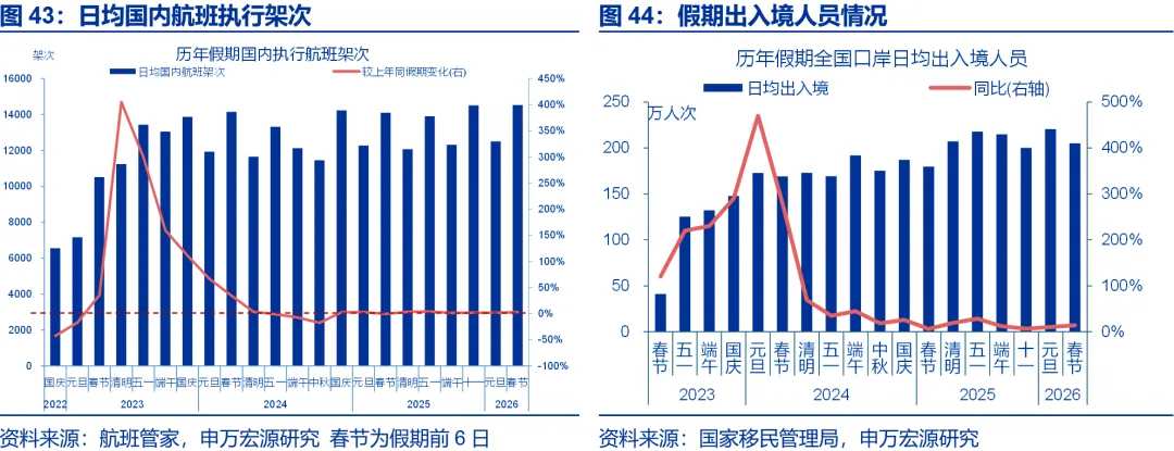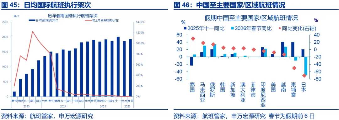 特征三:从执行航班架次看,国内执行航班架次延续上行,跨境出行热度则有回落。国内执行航班架次有所上行,春节假期第1-6日执飞航班数同比3%、较2025年十一假期上行1个百分点。相比之下,跨境出行热度有所回落,国家移民管理局预测,2025年春节假期全国口岸日均通关人数将达205万人次、较元旦假期回落7%。假期第1-6日,国际执行航班架次同比1.3%、较2025年十一假期回落9.1个百分点。其中,出境游热度回落较大,中国至日本、柬埔寨航班数同比分别较2025年十一假期回落70.4、50个百分点至-47.7%、-10%。入境游延续火热,去哪儿数据显示,春节假期首日(2月15日),使用非中国护照预订国内航班的数量同比增长近两成。