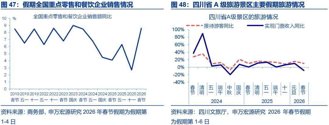 特征四:从旅游目的地看,假期内传统景点出行热度回升,特色旅游如“非遗游”等表现亮眼。假期第1-4天,全国重点零售和餐饮企业日均销售额同比8.6%、较2025年十一假期上行5.9个百分点,银联、网联累计交易达9.78万亿元,同比15.0%。从出行目的地看,传统景点热度回升,如四川省A级景区(第1-5日)接待旅客同比10.2%、较2025年十一假期上行1.9个百分点;门票收入虽有回落(同比回落14.9个百分点至-8.3%),背后与各地普遍推出门票减免、消费券发放等政策有关。情绪消费需求驱动下,春节出行呈现观光旅行向文化沉浸式体验转变的特征,如广东揭阳(3.8倍)、云南普洱(2.6倍)、河南开封(2.3倍)等非遗小城春节民宿预订量迎来翻倍式增长。