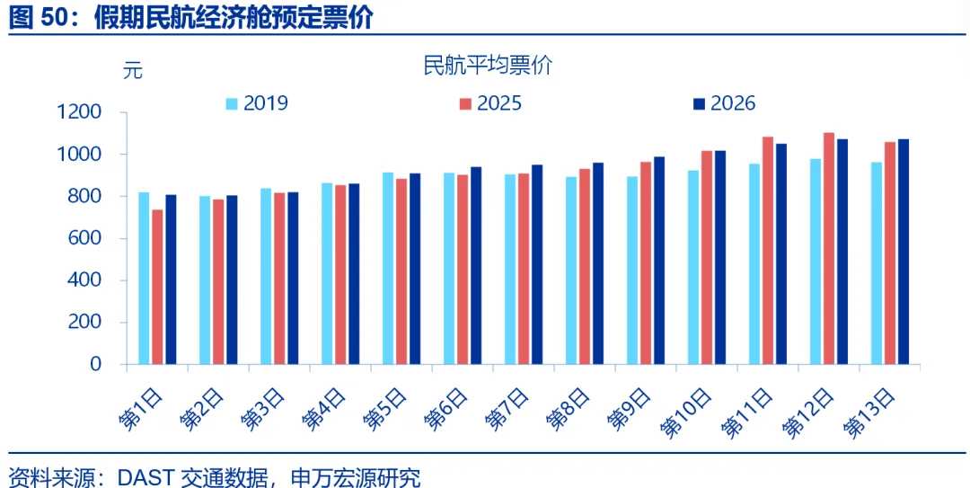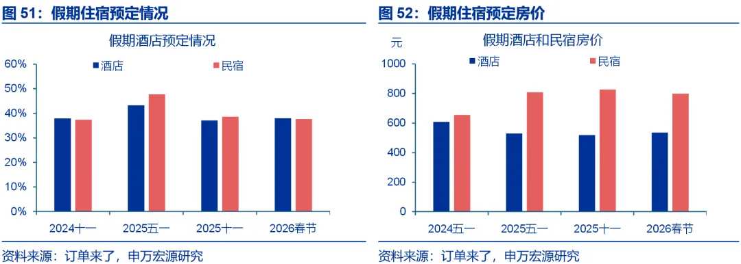 特征五:价格表现整体平稳,酒店、机票预售价格较去年同期均有上行。截至2月11日,春运期间预售机票价格(裸票价)平均为908元、高于去年同期(884元)、2025年十一假期(804元)的均价。住宿方面,截至2月14日,春节假期酒店、民宿预定率分别为37.9%、37.6%,分别较十一假期回升0.8、回落0.9个百分点。价格方面,酒店预定房价较去年同期上行5.4%,民宿价格持平去年同期。