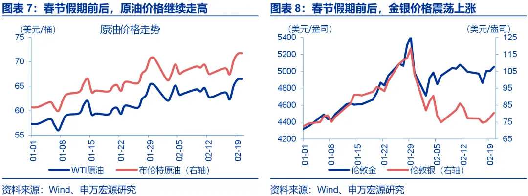 春节假期前后(2月16日-2月20日),油价继续走强、金价震荡走高。原油方面,美国最高法院否决关税法案提振了全球贸易复苏前景,叠加伊朗地缘局势再度升温引发供应中断担忧,供需两端利多共振,推动WTI原油、Brent原油分别大涨5.7%、5.9%至66.5美元/桶、71.8美元/桶。黄金方面,尽管美元指数反弹与美债收益率上行对黄金有小幅压制,但伊朗地缘激发的避险买盘与“GDP走弱+PCE反弹”的滞胀对冲需求形成支撑,金价在多空博弈中震荡上涨,伦敦金上涨1.2%至5053.2美元/盎司。