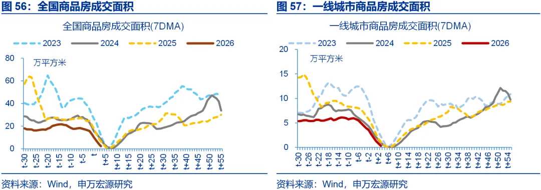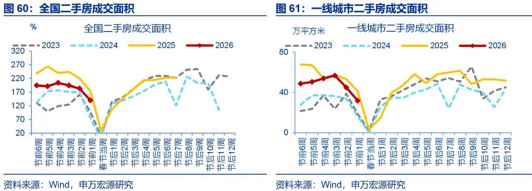 春节假期,全国新房、二手房成交偏弱,结构上一线成交回落幅度较大。假期第1-6日(2月15日至2月20日),30大中城市商品房成交面积合计10.2万平方米,同比-43%、较假期前1周回落10.6个百分点。结构上一线城市商品房成交面积回落幅度较大,同比较假期前1周下行14.7个百分点至-46.8%,二线、三线商品房成交面积回落幅度相对较小,同比分别较假期前1周下行7.4、12.5个百分点至-40%、-45.2%。全国二手房成交面积也有回落,假期前1周同比较假期前2周下行3.6个百分点至-20%;其中一线城市二手房成交面积同比回落7.6个百分点至-22.8%。