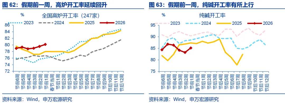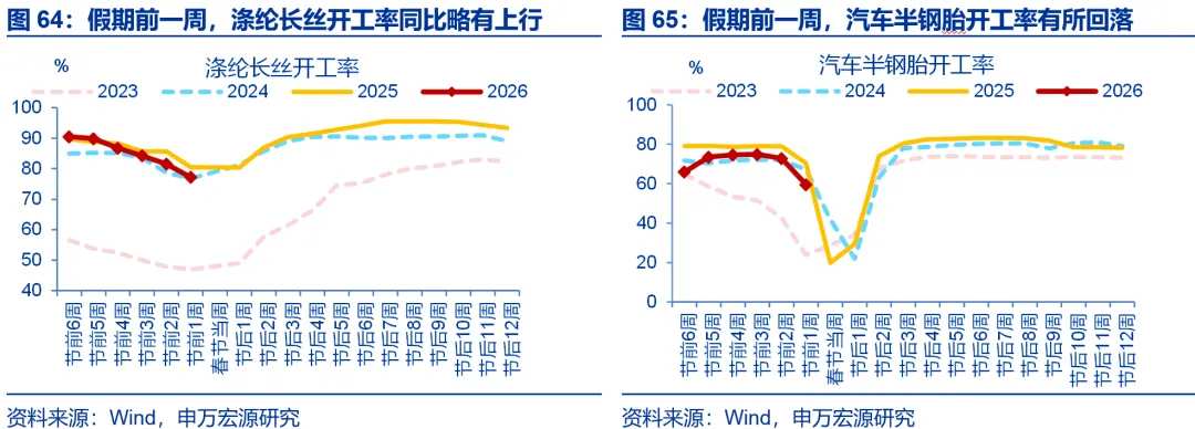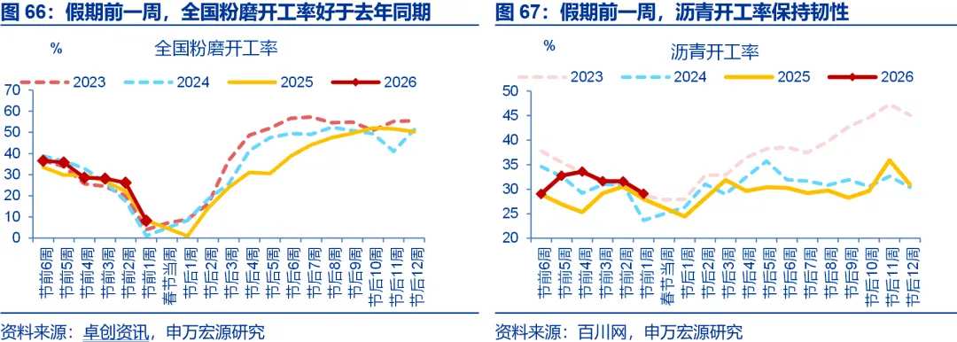 春节假期前,工业生产整体向好,建筑业开工表现分化。春节假期前1周(2月9日至2月15日),工业生产中,高炉开工延续上行(环比0.6%),同比维持在2.2%。石化链开工也有改善,纯碱、涤纶长丝开工同比分别较前周回升1.5、0.9个百分点至-2.2%、-3.3%。相比之下,汽车半钢胎开工率表现较弱,同比回落4.8个百分点至-10.9%。建筑业开工方面,更多反映地产投资的全国粉磨开工率有所走弱,同比回落4.2个百分点至-0.1%;沥青开工率维持韧性,同比维持在1.1%。