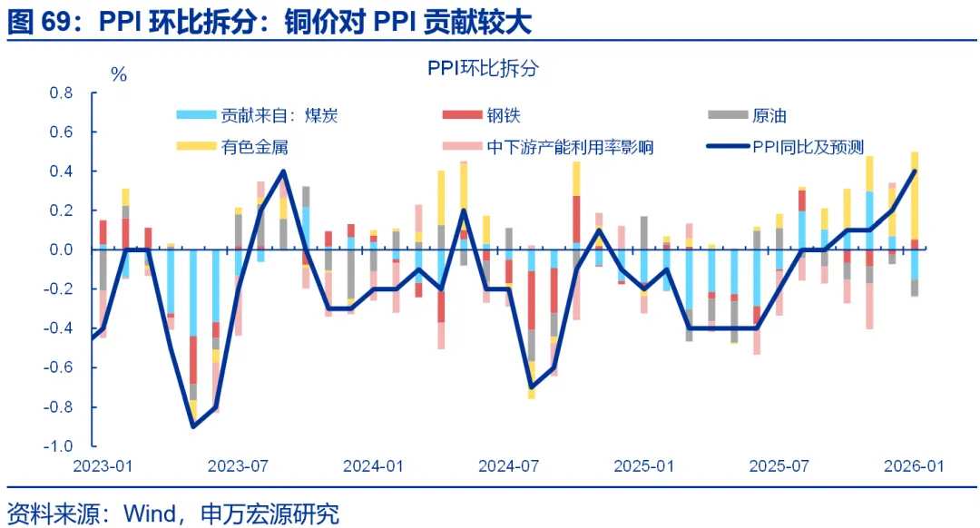 1月PPI降幅明显收窄,主因铜价对PPI的拉动进一步增加,基期轮换也有一定程度的影响。1月PPI环比0.4%,同比上行0.5pct至-1.4%。我国价格指数每五年进行一次基期轮换,2026年开始为新一轮基期轮换调整,测算本次基期轮换对每月PPI同比的影响平均约为0.08个百分点,总体较小。更重要的是,1月铜价涨幅进一步扩大(环比9.3%),相应有色采选、有色压延业价格环比分别5.7%、5.2%,拉动PPI环比0.5%,为最强贡献项。钢价对PPI贡献也为正,拉动PPI环比0.1%。
