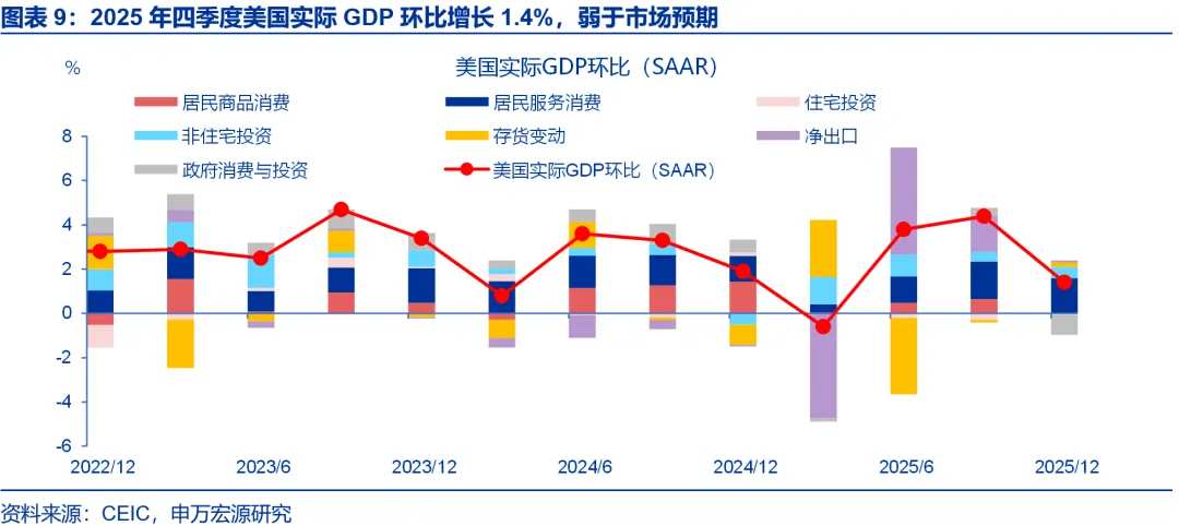 四季度美国GDP增速弱于预期,2025年全年经济增速仍达2.2%。美国2025年四季度实际GDP环比增长1.4%(年化),弱于市场3%的预期,也低于三季度的4.4%。根据数据公布前的亚特兰大联储GDPNow预测,可见此次数据低于预期的拖累主要来自政府消费及投资。但综合来看,2025年美国全年经济增速为2.2%,显著强于2025年初的市场预期。