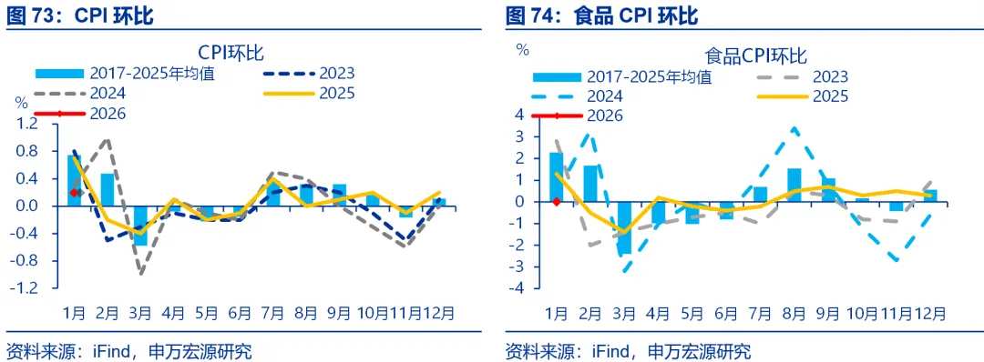 受春节错位的影响,1月CPI同比明显回落;但剔除该因素后,CPI整体仍偏弱。统计局测算,本轮基期轮换对CPI影响拉动每月CPI同比0.06个百分点。而2026年春节与2025年形成错位,导致1月CPI在高基数的影响下,同比较前月回落0.6个百分点至0.2%。而1月CPI环比仅0.2%、明显低于往年春节前月的CPI表现(0.6%),反映出整体CPI仍较弱。结构上,食品CPI同比回落幅度较大,较前月下行1.8个百分点至-0.7%。其中,鲜菜、鲜果CPI同比分别回落11.3、1.2个百分点至6.9%、3.2%。猪价受前期存栏数较高影响,同比维持在-13.7%低位。