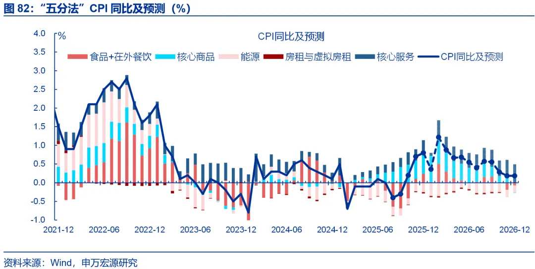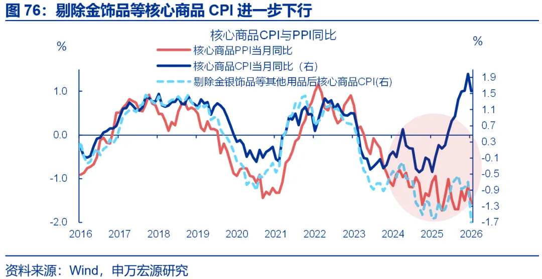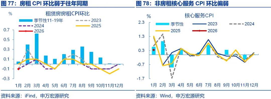剔除金价影响后,核心商品CPI也相对偏弱。1月核心商品CPI同比回落0.4个百分点至1.6%。拆分结构看,1月金价同比上行至68.7%,带动金饰品价格的同比涨幅继续扩大至77.4%;而剔除金饰品后的其余核心商品CPI同比明显下行、较前月回落1个百分点至-1.7%。结构上家电CPI进一步走强,或更多反映供给的影响,与铜等原材料涨价和反内卷的传导有关,但其他领域价格仍较弱。