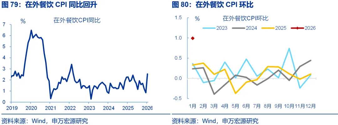 剔除春节错位后,服务CPI也弱于往年春节前月,或与“返乡潮”提前有关。受春节错位的影响,1月,服务CPI同比回落0.5个百分点至0.1%。拆分结构看,服务CPI中最大单项是锚定房租变化的虚拟房租CPI受租房需求影响较大,目前租房需求较弱令1月房租CPI同比继续回落(-0.1pct至-0.4%)。核心服务CPI也偏弱,1月环比0.3%、低于往年春节前月的服务CPI表现(0.6%)。但统计在食品烟酒中的在外餐饮CPI有所改善、同比上行1.7个百分点至2.5%。