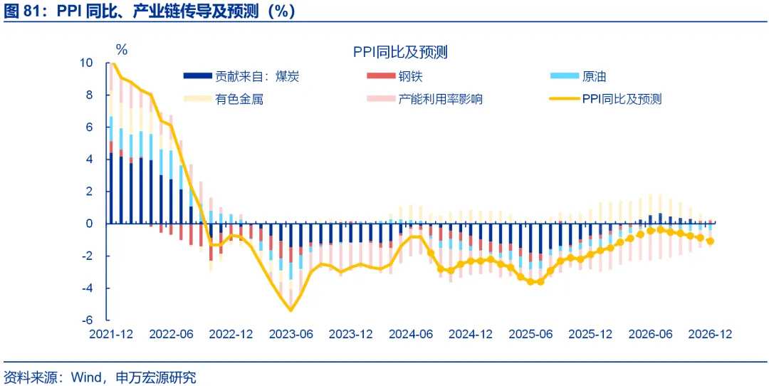 相比之下,煤油等大宗商品价格、中下游PPI表现偏弱。国际原油价格下行影响国内石油开采、精炼石油产品制造价格分别下降3.1%和2.5%,油价拖累PPI环比-0.08%,煤价也有走弱,拖累PPI环比-0.15%。中下游产能利用率也未明显改善,导致上游涨价对中下游的拉动相对有限,测算中下游仅拉动PPI环比0.1%。其中,酒和饮料、医药等行业PPI环比分别-1.4%、-0.9%。
