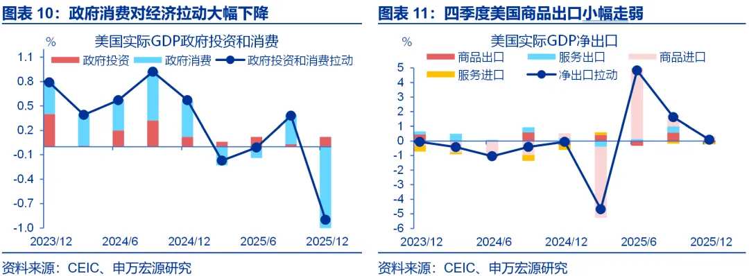 四季度,史上最久政府关门导致政府消费大幅拖累经济增速。四季度美国GDP数据最大的拖累来自于政府部门,政府消费拖累实际GDP增速(环比年化)1个百分点,三季度为拉动0.36个百分点,政府关门是主要影响因素。但是,这一因素是暂时性的,一季度政府消费大概率出现反弹。
