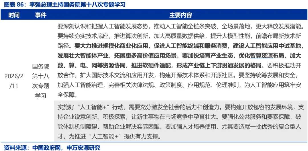 2月11日,国务院以“深化拓展‘人工智能+’、全方位赋能千行百业”为主题开展第十八次专题学习。专题学习会议强调要全面推进人工智能科技创新、产业发展与赋能应用以培育新质生产力,明确要推动人工智能全链条突破与全场景落地;通过推进算法创新、加大高质量数据供给、提升大模型性能夯实技术底座;通过促进终端和服务消费、建设中试基地、发展智能体产业推进规模化商业化应用;通过优化智算资源布局、强化数算电网协同、推进软硬件适配培育产业生态。