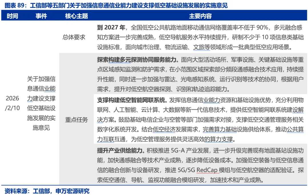 2月10日,工信部等五部门联合印发《关于加强信息通信业能力建设 支撑低空基础设施发展的实施意见》,旨在强化信息通信业对低空基础设施的支撑作用,推动低空经济健康发展、培育新质生产力。意见明确坚持“需求牵引、集约复用、试验先行、安全可控”原则,提出到2027年全国低空公共航路地面移动通信网络覆盖率不低于90%、研制不少于10项信息类基础设施标准、形成一批典型低空应用场景的目标,重点部署了按需推进低空通信网络覆盖、构建多元探测协同服务能力等。