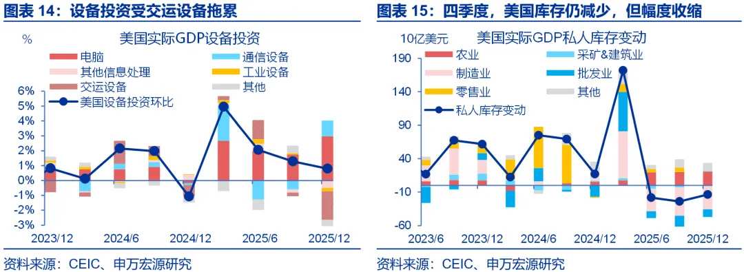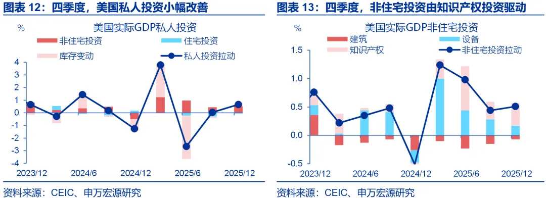 四季度AI投资表现稳健,库存下降幅度收窄,住宅投资边际改善。四季度,美国私人投资对实际GDP增速(环比年化)的拉动达到0.66个百分点,三季度为0.03个百分点,主要拉动力来自于库存变动,其次为住宅投资。1)住宅投资方面,随着美联储降息、特朗普政策改善住房可负担性,2026年美国房地产市场或处于“温和”复苏阶段;2)非住宅投资方面,结构上知识产权投资拉动提升,设备投资有所放缓,后者受交运设备拖累,可能与汽车消费疲软、关税不确定性有关。换句话说,四季度AI相关投资仍然对经济增长形成支撑;3)库存方面,四季度美国私人库存变动拉动经济增速0.21个百分点,较三季度提升0.33个百分点,对应美国私人库存下降幅度收窄。随着2025年前期囤积的库存消耗,美国库存周期有望转向补库。