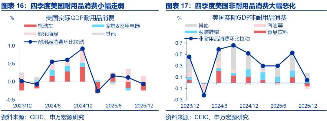 四季度美国居民商品、服务消费双双走弱。四季度,商品消费、服务消费对实际GDP环比增速的拉动分别为-0.01、1.59个百分点,三季度分别为0.64、1.70个百分点,可见商品消费走弱幅度更大。商品消费结构中,非耐用品消费大幅走弱,可能受到政府关门间接冲击(食品券发放中断等),耐用品消费拖累主要来自于机动车。