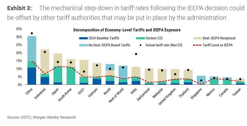 摩根士丹利认为,如果进口商将收到退税但又必须以额外未来进口关税的形式偿还该退税,那么这接近于现状结果。但如果政府选择让有效关税率在完成新的第232条款和第301条款调查期间下降(最有可能发生在今年晚些时候或2027年),这将导致通胀暂时面临下行压力,并将企业支付新进口关税的时间推迟到2027年,从而对经济活动增长持更建设性的看法。
