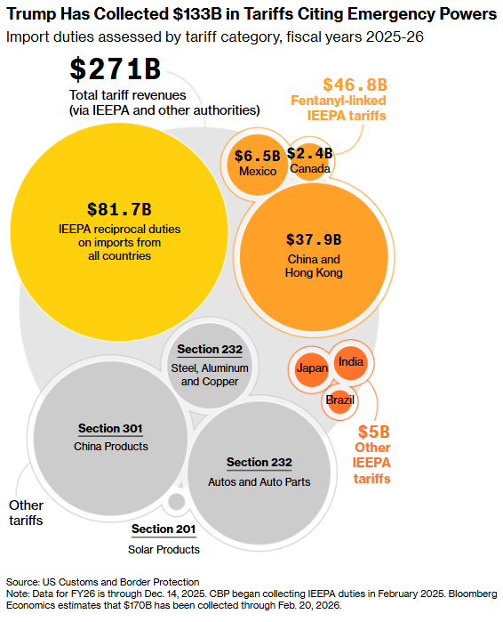据高盛测算,政策调整后,自2025年初以来的有效关税率增幅将从略高于10个百分点降至约9个百分点,基本符合市场此前预期。摩根士丹利指出,假设现有关税结构将转移至不同法律授权并基本维持原状,且退税规模有限(以850亿美元为中点估计),企业支出或招聘意愿不会出现重大变化。