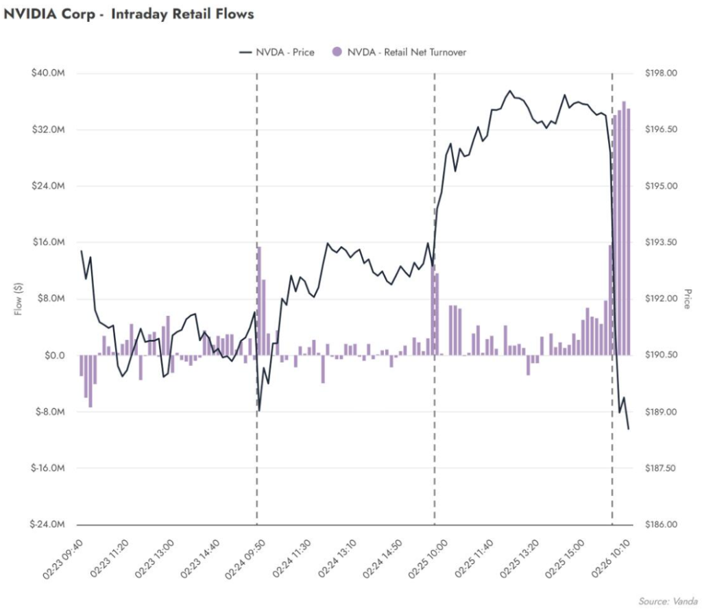 Vanda Research指出,尽管初期价格走势疲软,但散户整体上并未参与抛售。反而随着股价下跌,散户在整个交易时段内保持了持续的净买入状态。