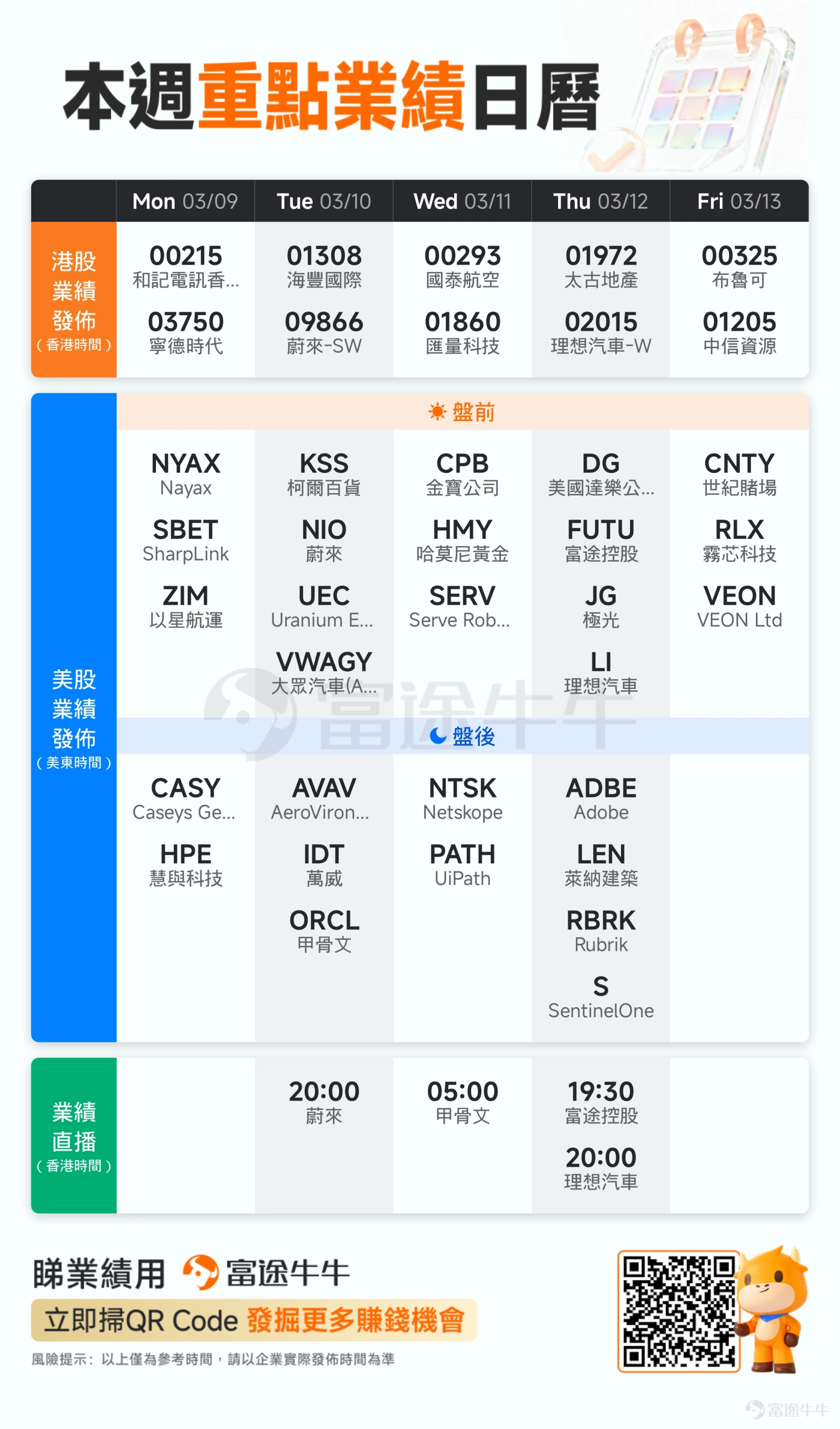 业绩方面,港股$太古地产 (01972.HK)$、$理想汽车-W (02015.HK)$ $理想汽车 (LI.US)$ 发布业绩;美股盘前, $美国达乐公司 (DG.US)$ 、 $富途控股 (FUTU.US)$ 、 $极光 (JG.US)$ 发布财报;美股盘后,$Adobe (ADBE.US)$、$莱纳建筑 (LEN.US)$、$Rubrik (RBRK.US)$、$SentinelOne (S.US)$发布财报;