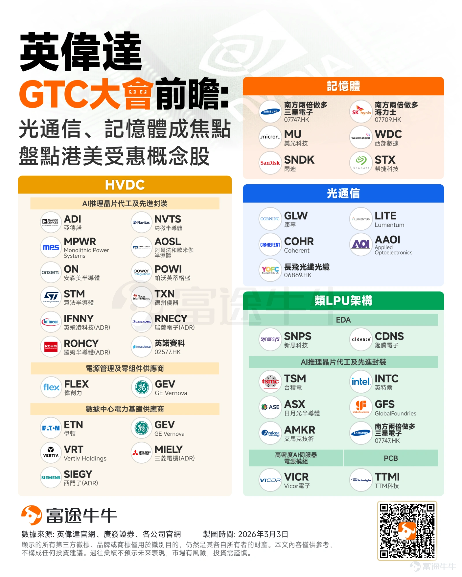 ①3月16日至19日,英伟达GTC 2026将在美国加州圣荷西如期举办;②黄仁勋透露,本次GTC将发布“一款令世界震惊的芯片”;③野村东方国际证券指出,投资者将期待英伟达公布CPO技术的更多路线图细节。