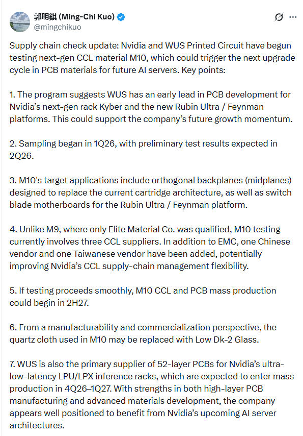 根据郭明錤的供应链调查,$英伟达 (NVDA.US)$与沪电股份已正式开启M10 CCL材料的测试工作。采样工作于2026年第一季度启动,初步测试结果预计于2026年第二季度出炉。