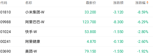 截至收盘,小米集团-SW(01810.HK)跌8.59%、阿里巴巴-SW(09988.HK)跌6.29%、快手-W(01024.HK)跌2.80%。