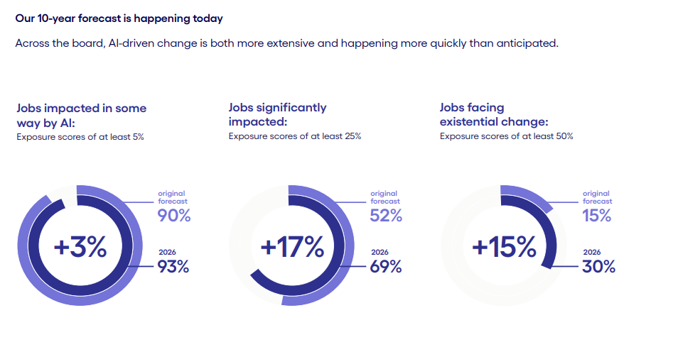 Cognizant还警告,人们低估了人工智能的影响,原以为2032年才会发生的事情,现在已经发生。人工智能已经以某种方式影响到93%的工作岗位,比预期提早了六年。