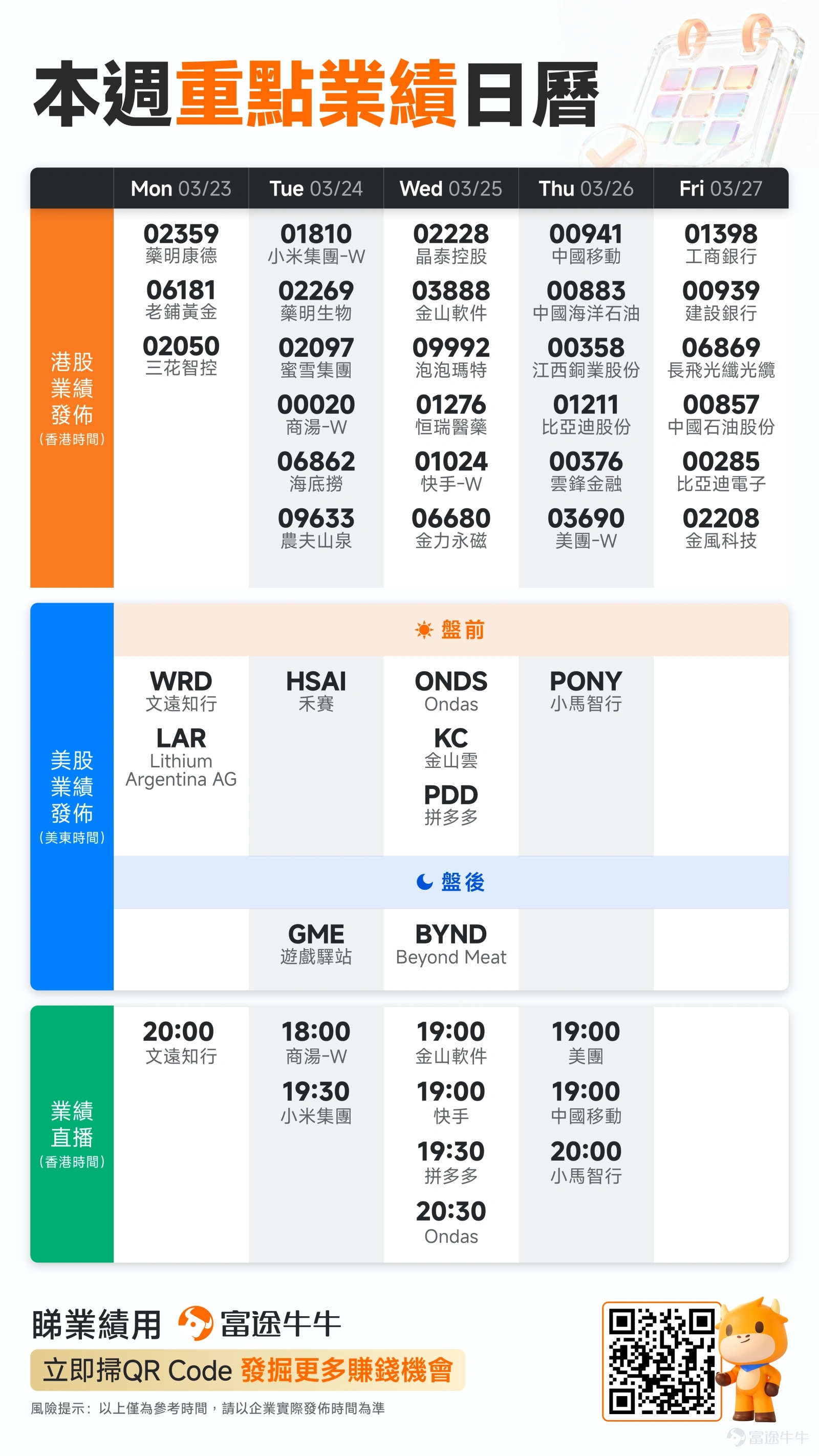 业绩方面, $美团-W (03690.HK)$、 $中国移动 (00941.HK)$、 $中国海洋石油 (00883.HK)$、 $比亚迪股份 (01211.HK)$ 等港股将公布财报,此外,美股 $小马智行 (PONY.US)$ 将于美股盘前公布业绩。