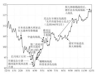 在1942年初的冬天以及春天,日本威胁入侵澳大利亚,并且在东南亚战场所向披靡,纽约和伦敦的股价急剧下跌。盟军接连失利,日军看起来不可战胜,德国对苏联的新攻势取得了成功,英国在沙漠战场连续失利,这一切都让投资者深感不安。尽管道琼斯工业平均指数在东京遭空袭后短暂上涨,但截至4月底,整年跌幅为20%,并且在1942年4月30日达到最低点,只有92点,较1941年初的132点下跌30%。
