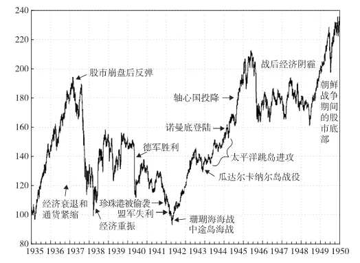 第二次世界大战关乎自由和民主,但也关乎资本主义的存亡,在一定程度上也关乎股市的未来续存。股市作为资本供应者,自主决定股价。全球各地的股市在20世纪40年代初的动荡中虽然偶有失手,但在大部分时间都能很好地理解战争的跌宕起伏。这必定是因为股市群体的内在智慧,因为交战各方都控制着战争新闻,并将宣传作为武器。