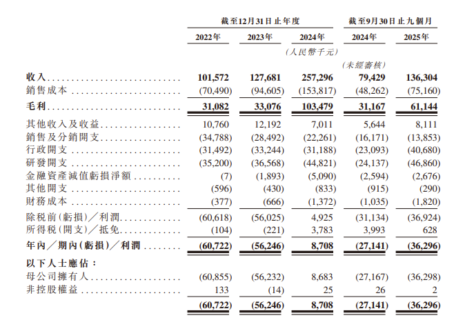 收入由2022年的人民币101.6百万元增加至2023年的人民币127.7百万元,并进一步增至2024年的人民币257.3百万元。公司的收入由截至2024年9月30日止九个月的人民币79.4百万元增加至截至2025年9月30日止九个月的人民币136.3百万元。